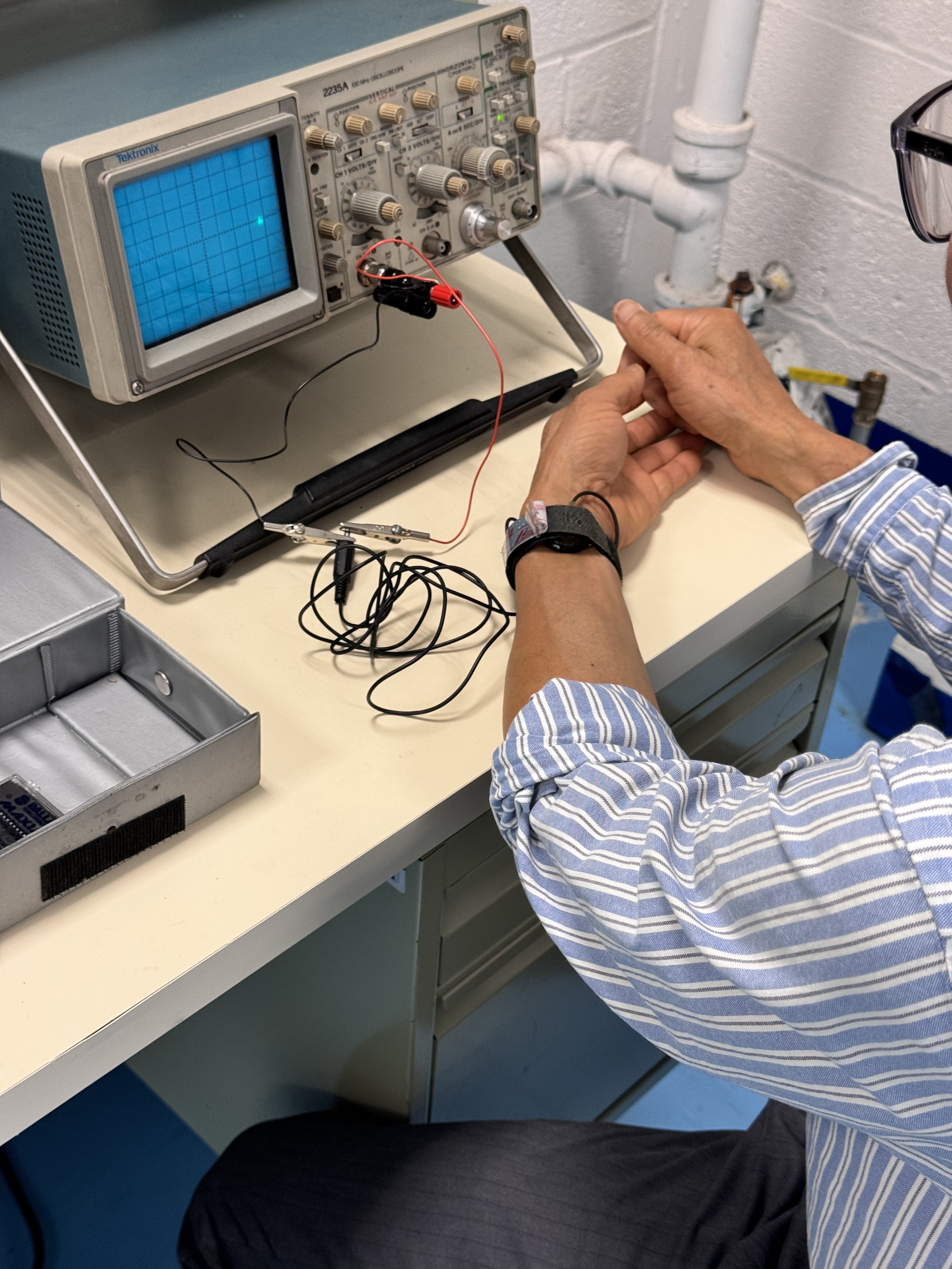 The goal of this project was to design an in-house device capable of noninvasively detecting irregular heartbeats using a pulse transducer. The image on the left demonstrates how a person’s heartbeat can be captured on an oscilloscope. Our objective was to develop a system that could monitor pulse rate in real time and provide meaningful feedback to the user.